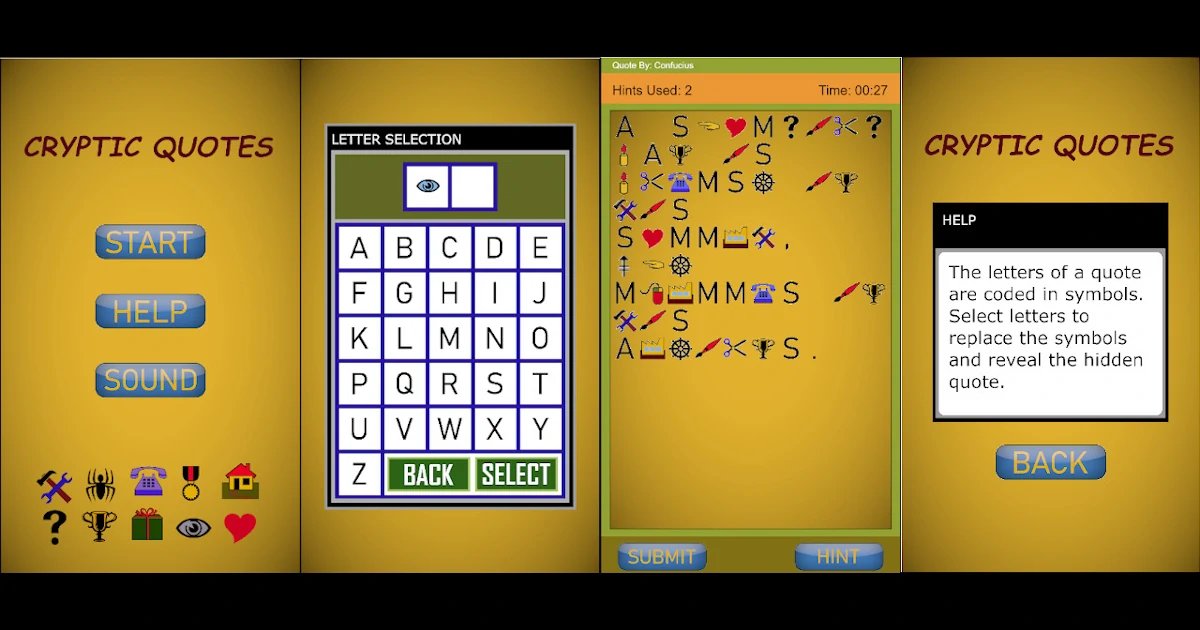 The letters of a randomly selected famous quote are coded in symbols. Your goal is to select the correct letters and reveal the hidden quote.*mouse* = Left Click on a symbol to replace it with a letter.