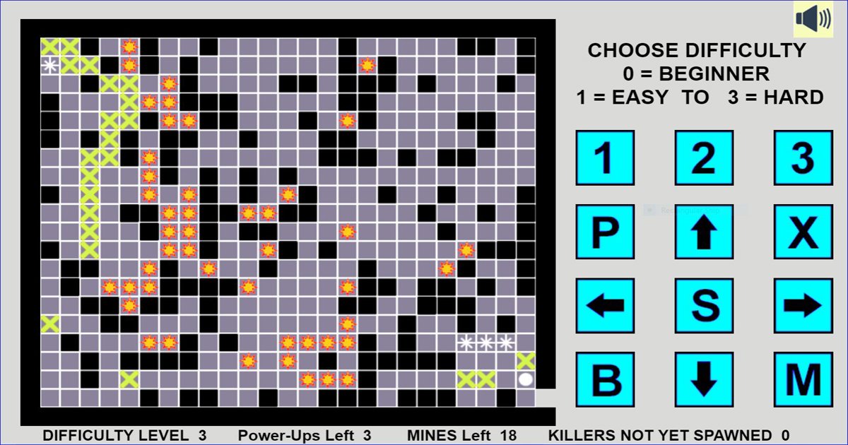 StratEvade 2 (A Sequel to StratEvade --- More Features, More Strategy) is a turn-based strategy escape and evasion game. The object of the game is for the PLAYER to move across a large GRID to an EXIT while being pursued by an ever increasing number of spawned KILLERS. The PLAYER may set BARRIERS and MINES to block and destroy the pursuing KILLERS. BLOCKERS are spawned every turn to further impede the PLAYER's progress. PLAYER may break through a BLOCKER by using a POWER-UP.*arrows**mouse**touch**1..3**b**m**p**s**x*