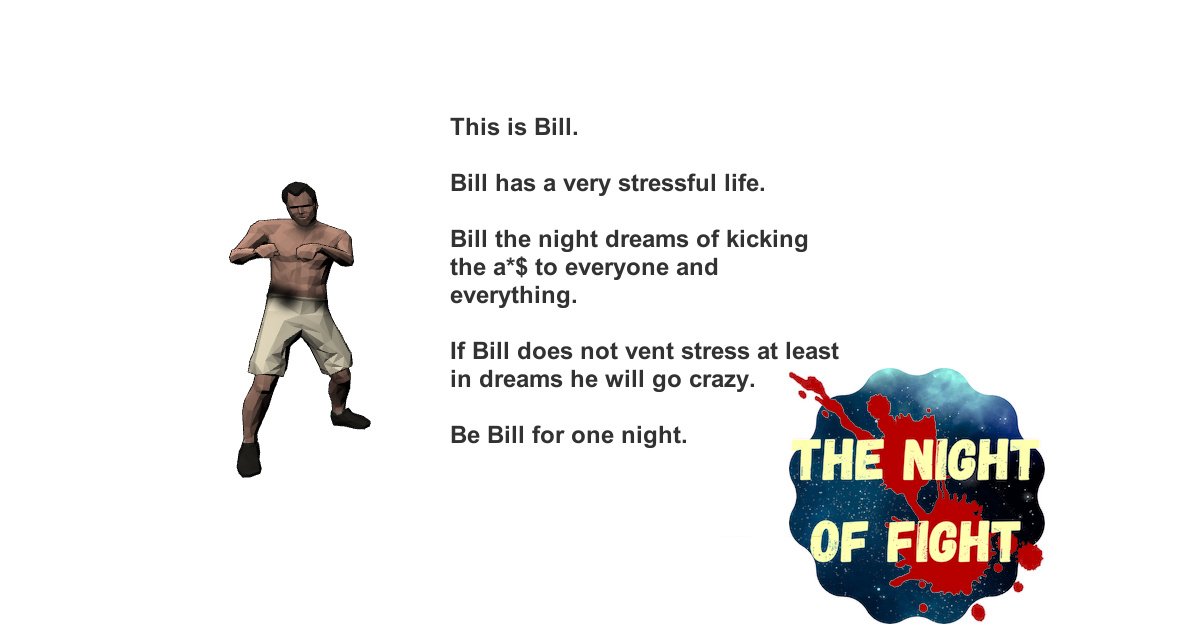 Bill has a very stressful life. Bill the night dreams of kicking the a*$ to everyone and everything. If Bill does not vent stress at least in dreams he will go crazy.Be Bill for one night in this webgl game.